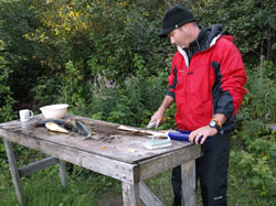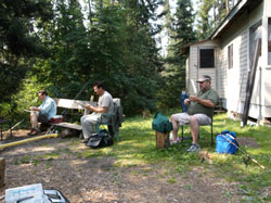 8/10: Arrive at the border about 7am local time (smooth 13 hour drive) and make the routine stop at the “Holiday” for gas, phone calls home, and computer chips for Orvis’s satellite tracking device. Breakfast at the Chocolate Moose and the cross the border at about 9am. Only minor freeze up from “CupO” as he inadequately described our tobacco quantity as “a handful” after lying about the amount of alcohol we had in our possession. Oh yeah! “The” Rookie forgot to sign his passport but the crossing guard was so tickled watching Jim explain “a handful” that she only warned us about the nasty American guards and suggested we find a pen before we returned, then waved us through. Arrived at the Fabulous Balmer Motor Hotel about 2:30pm local time to complete our restful 19 hour drive. Checked in, naps, restless walks to town, worms from George the disgruntled sport shop owner, drinks and dinner with a floor show, then off to bed for an 8:45am departure in the morning.