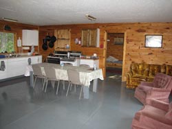 The cabin sleeps 12 in 3 bedrooms. The boys took the room inside the front door to make it easier for the hungry bear to find them. The kitchen has 2 large stoves and 2 large electric fridges. The Honda generator was a nice and pretty quiet touch. Clayton adorned the tri-outhouse complex with tropical fruit fresheners putting him in contention and an early leader for the Martha Stewart award.