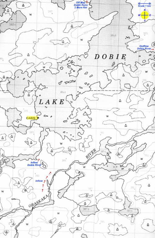 Up at sunrise (everyday occurrence 5:30am). Bob and Andy to bay north of cabin and John and Neil to bay south of cabin. Eggs and bacon for breakfast. John and the Clarks headed to the rock ridden outflow and got separated. They discouraged all from repeating - shallow and rocky with current (sound familiar). The other 6 went to the left ear with little luck as the winds picked up. Saw a moose swim across north end of left ear.
