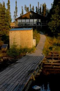 The 2nd flight attempted a stunt landing on 1 pontoon, but deferred to a more conventional 2 toon landing to the relief of Robert and the observers. The winds and surf made “shipping” pretty difficult that 1st day and we only delivered a few small packages of Walleye to the dock. Spaghetti dinner and rookie orientation (Tom Lacaria and Garrett Haldrup issued bear bells and other non-speakable activities) before bed at midnight. The southeast-facing cabin sits 25 feet above the lake.