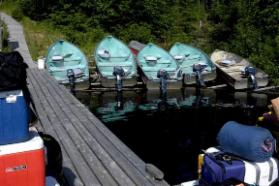 Indy crowd right on schedule. After a last minute stop at the usual gas station and adjacent tackle shop, we headed to the border for the anxious and always botched crossing. The Sigurds took the lead and managed to barely convince the border babe that G belonged to me and that his “other” parent knew about and supported the trip into the North Woods. The Vowell vehicle encountered a tense moment when Robert responded that the purpose of the trip to Canada was “shipping”. The Shields van denied having any alcohol and passed without incident (when unloading the van, however, Randy and Tom discovered a few cases of beer). You would think that we could handle a few questions, but seem to screw it up every year. The outfitter is only 10 minutes down the road from the border and we pulled in to the parking lot at 9am. The 1st flight of 8, including the rookies, departed at 10:10am and landed at 11:45am.