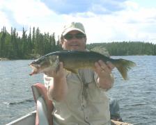 July 25-29: Fish Everywhere and not a mosquito in sight - And so it goes for the next 5 days. We find fish in all the places we expect to find fish with several submerged reefs, many islands and wind blown points, this lake abounds in walleye habitat. Not too much trouble to put 100 fish in a boat daily, but we moved around quite a bit to keep things interesting and to keep finding fish. Not a lot of huge fish - only a handful at 24 plus, Stan goes for big fish at 26, but everyone gets plenty of nice fish above 20 inches. Not much Northern to speak of, but without Orvis, we really didn't spend too much time throwing the heavy artillery around. We end the week with a conservative estimate of 1500 walleye. Pretty great fishing - some of the best quantities we have ever had.