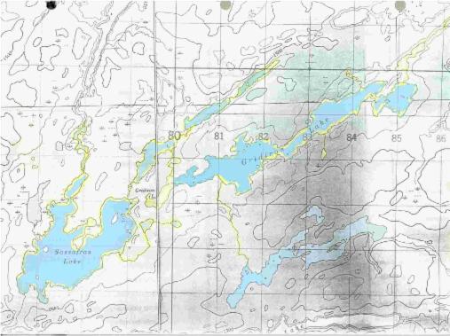 Everybody portaged into Sassafras Lake which meant carrying our motors several hundred yards up a hill on a narrow path. Found some Northern at the outflow from the connector lake between Gridiron and Sassafras. Visited abandoned cabin on Sassafras, they have recently clear cut one end of the lake. Very hot day, Andy and Jack had a swim. Ate lunch on rocks near inflow stream. After dinner, we hit several nice Northern and Walleye at NorthEast end of lake. Randy caught large Northern 5.5 lb and 2.5 lb Walleye to win the day.